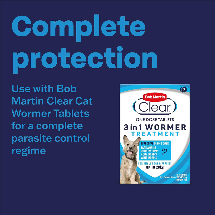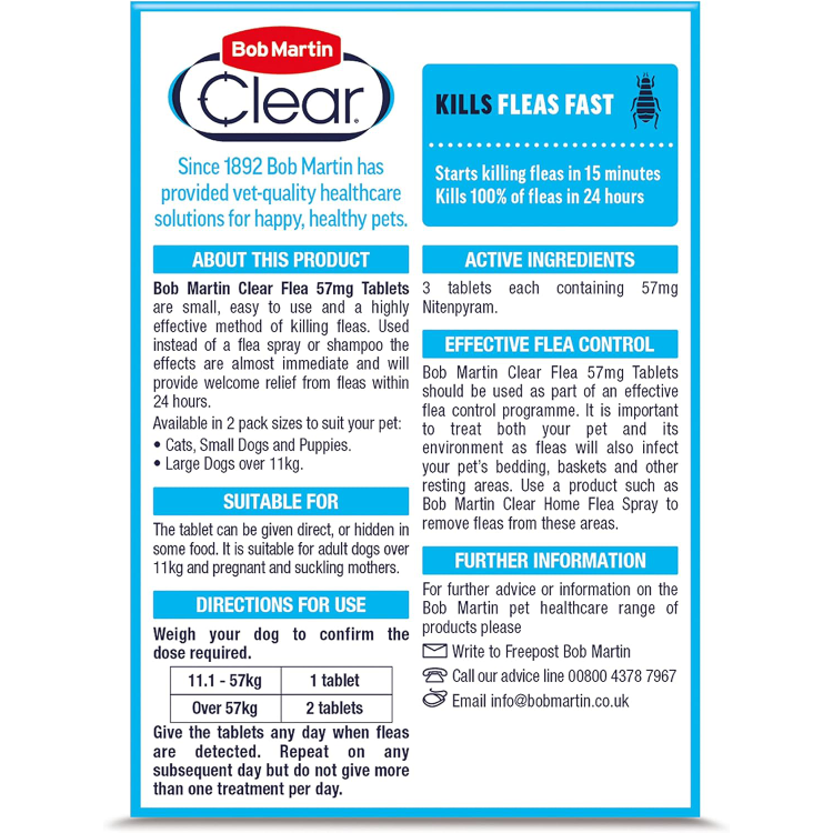 Bob Martin Clear Flea Tablets are an effective method of killing adult fleas on your pet but can only be fully effective as part of a programme to eliminate fleas and larvae on the pet and in the pet’s surroundings. Pet bedding and favourite resting areas should be vacuumed regularly and treated with a suitably approved insecticide preferably containing an Insect Growth Regulator (IGR). Consult your vet if signs of health concern persist.