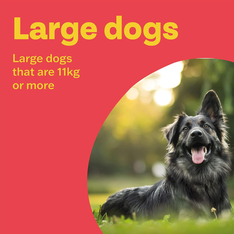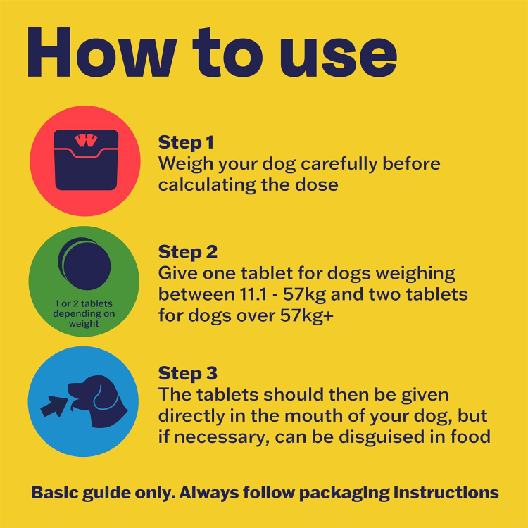 Give one 57mg tablet for dogs between 11-57kg and two tablets for dogs over 57kg