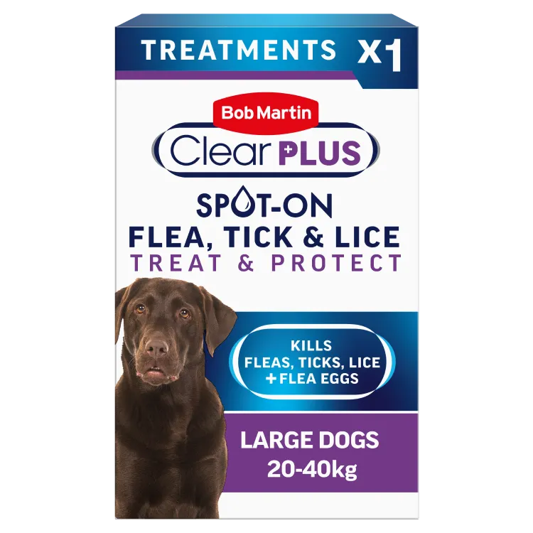 Bob Martin Clear Plus – Flea and Tick Spot-On for Large Dogs can be used on dogs weighing between 20-40kg and over 8 weeks old.