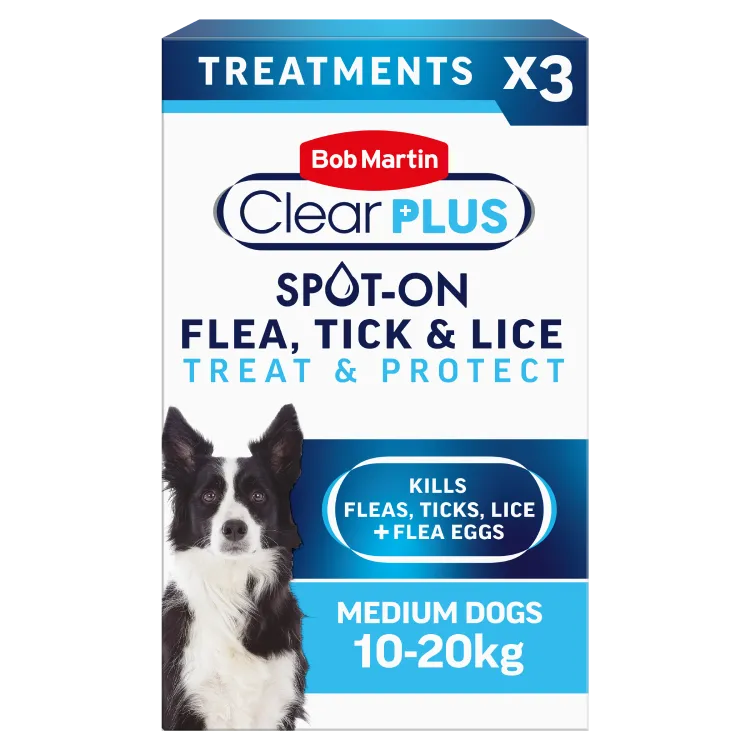 Bob Martin Clear Plus – Flea and Tick Spot-On for Medium Dogs can be used on dogs weighing between 10-20kg and over 8 weeks old.